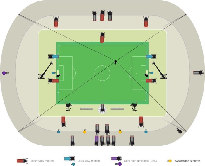Tất cả các luồng thông tin sẽ được camera thu lại từ 12 sân vận động của World Cup qua hệ thống cáp quang đến VAR, còn các trọng tài trên sân và trợ lý VAR sẽ liên lạc với nhau bằng một thiết bị audio kết nối bằng cáp quang. Sẽ có tất cả 33 camera khác nhau, 8 trong số đó là các camera quay chậm và 6 camera quay siêu chậm.