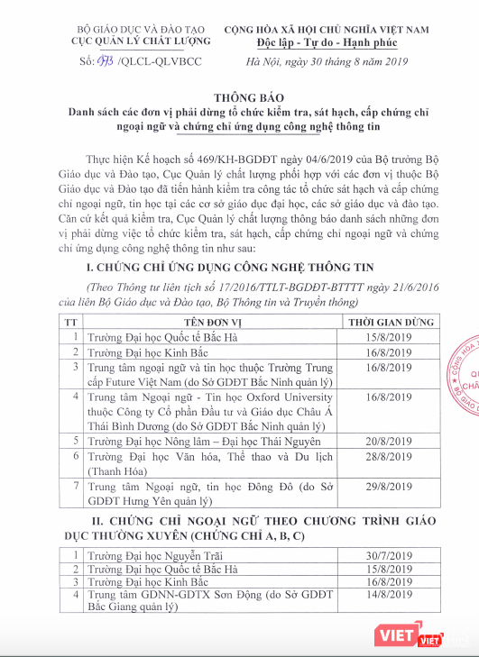 VietTimes -- Cục Quản lý chất lượng, Bộ Giáo dục và Đào tạo (GD&ĐT) vừa có văn bản công khai danh sách gần 50 đơn vị phải dừng tổ chức kiểm tra, sát hạch, cấp chứng chỉ ngoại ngữ và chứng chỉ ứng dụng công nghệ thông tin.