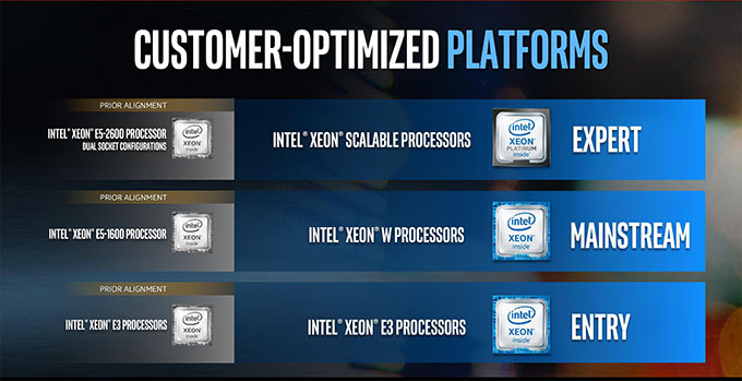 Trong năm 2017, Intel đã giới thiệu một bộ định vị mới dành cho dòng chip Xeon. Trước đây các dòng chip được phân biệt bằng mã như E3, E5 hay E7, nhưng từ cuối tháng 8 Intel đã ra mắt dòng Xeon W, qua đó định rõ 3 dòng vi xử lý cho máy trạm:
