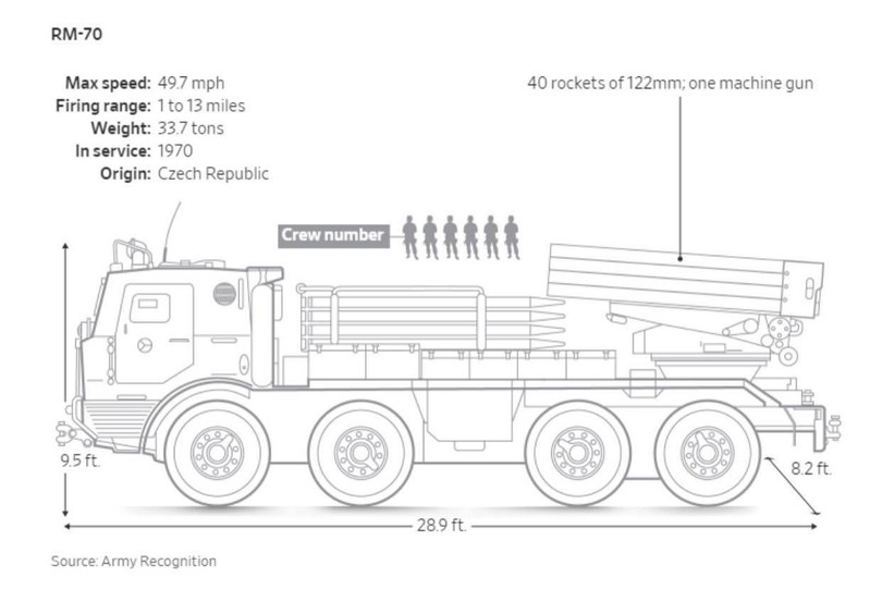 Cộng hòa Séc đã chuyển cho Ukraine khoảng 20 hệ thống phóng tên lửa RM-70, một hệ thống tương tự như Grad của Nga. Theo Mỹ, hệ thống này có thể bắn nhiều tên lửa và loạt đạn riêng rẽ. Biến thể RM-70 Vampire là phiên bản được nâng cấp của Slovakia, với tốc độ lên tới 56 dặm/giờ cùng hệ thống lái bán tự động. Mẫu vũ khí này cũng nằm trong số thiết bị quân sự mà Séc gửi cho Ukraine.
