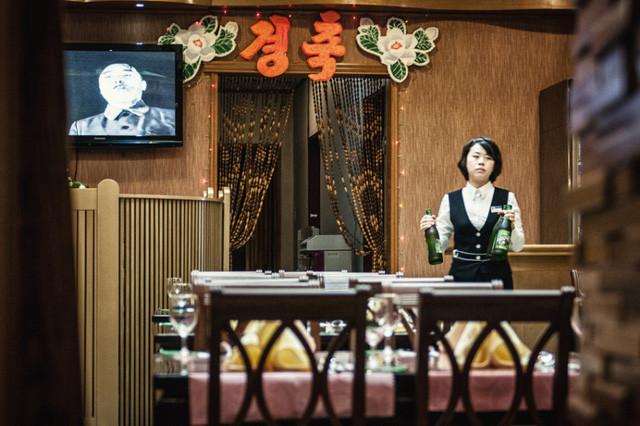 Một nữ nhân viên phục vụ tại một nhà hàng ở Triều Tiên, nơi các hình ảnh tuyên truyền được phát trên truyền hình cả ngày.
