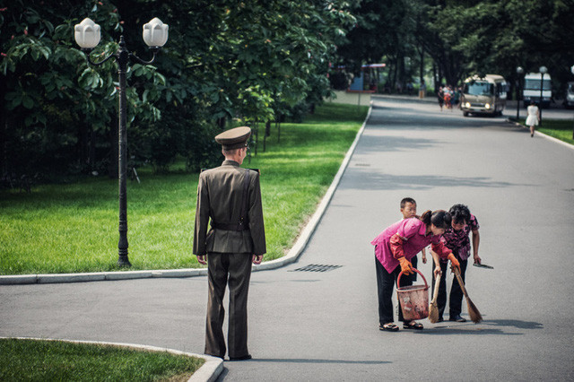 Một binh sĩ Triều Tiên giám sát các phụ nữ dọn rác trên đường phố ở thủ đô Bình Nhưỡng. Nhiếp ảnh gia Michal Huniewicz, sống tại London, đã chụp lén các bức ảnh này trong chuyến thăm tới Triều Tiên vào năm 2015.