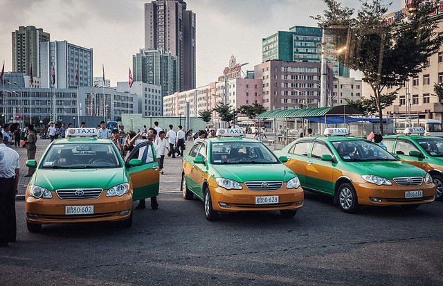 Những chiếc xe taxi sơn màu xanh pha vàng ở Bỉnh Nhưỡng.