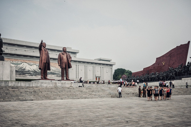 Tượng đồng lãnh tụ Kim Nhật Thành và cố lãnh đạo Kim Jong-il tại thủ đô Bình Nhưỡng. Huniewicz đã được cảnh báo về việc không chụp ảnh tại những địa điểm không được phép.