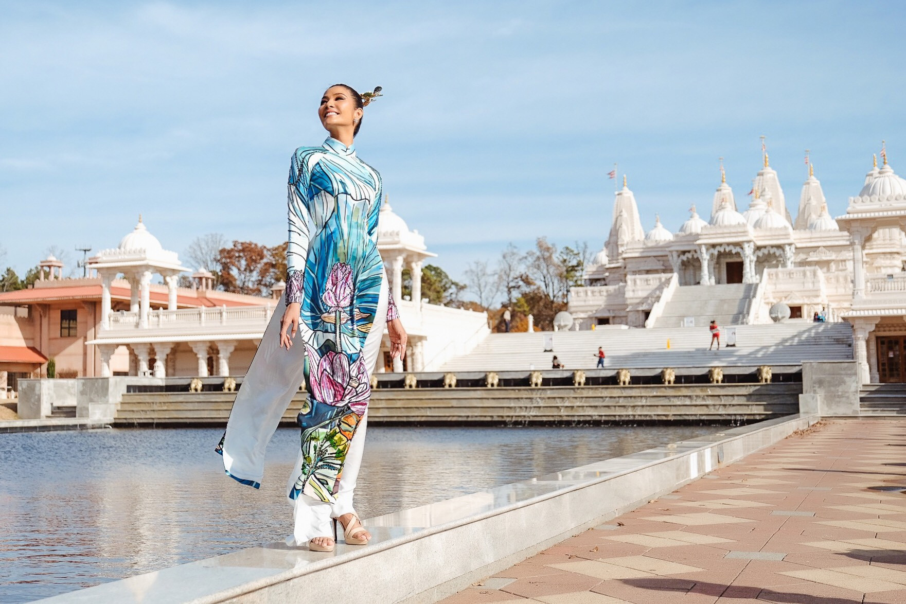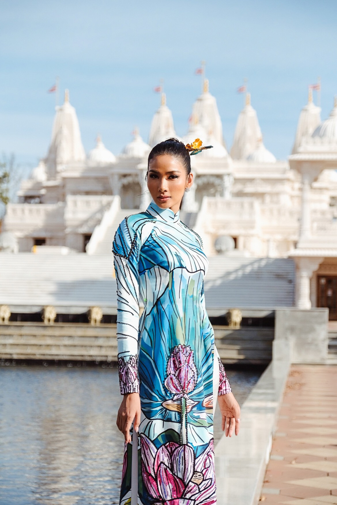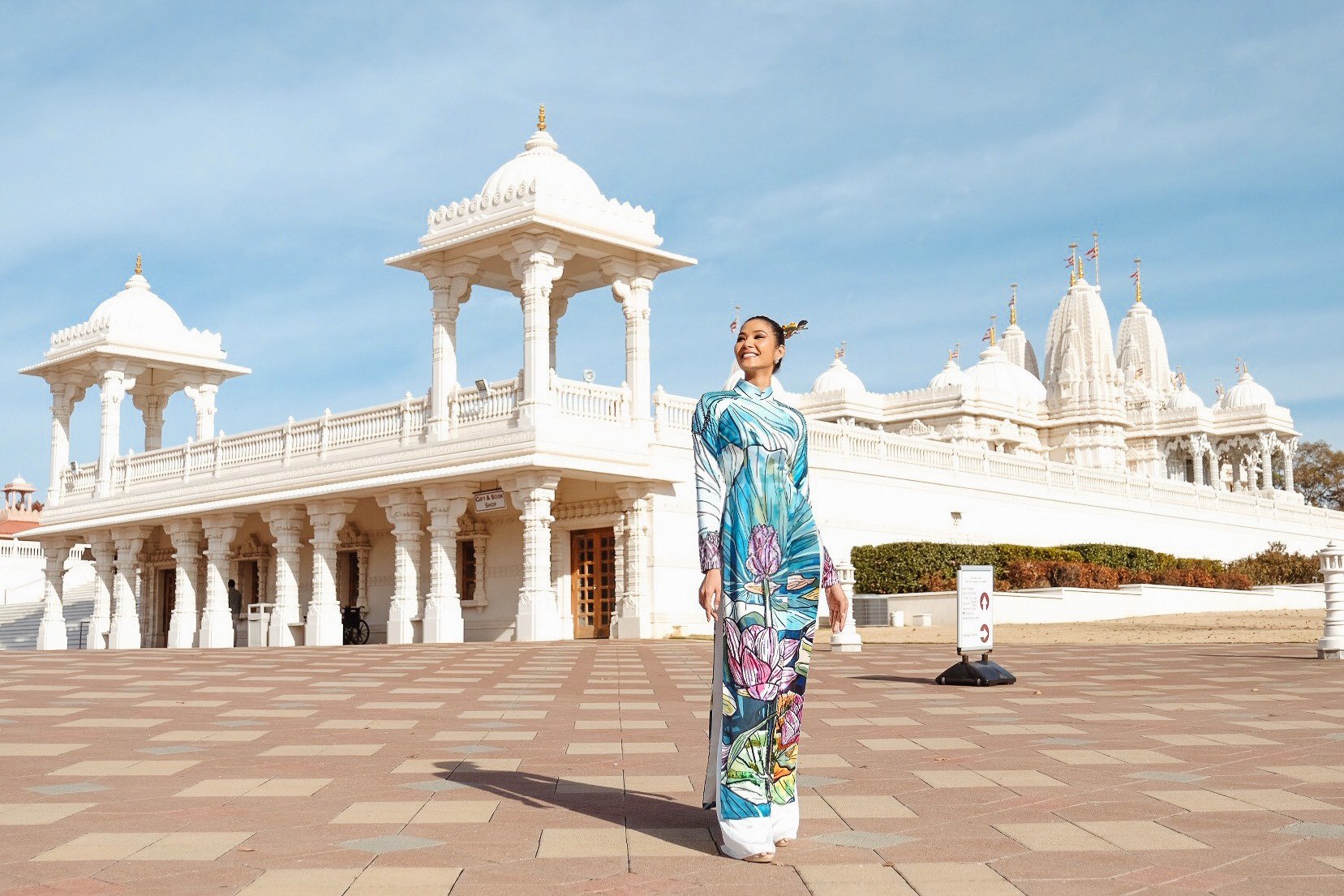 Những hình ảnh đầu tiên từ Mỹ gửi về cho thấy thần thái vui tươi, mạnh khỏe, đặc biệt Hoàng Thùy gây ấn tượng với hình ảnh áo dài hoa Sen.