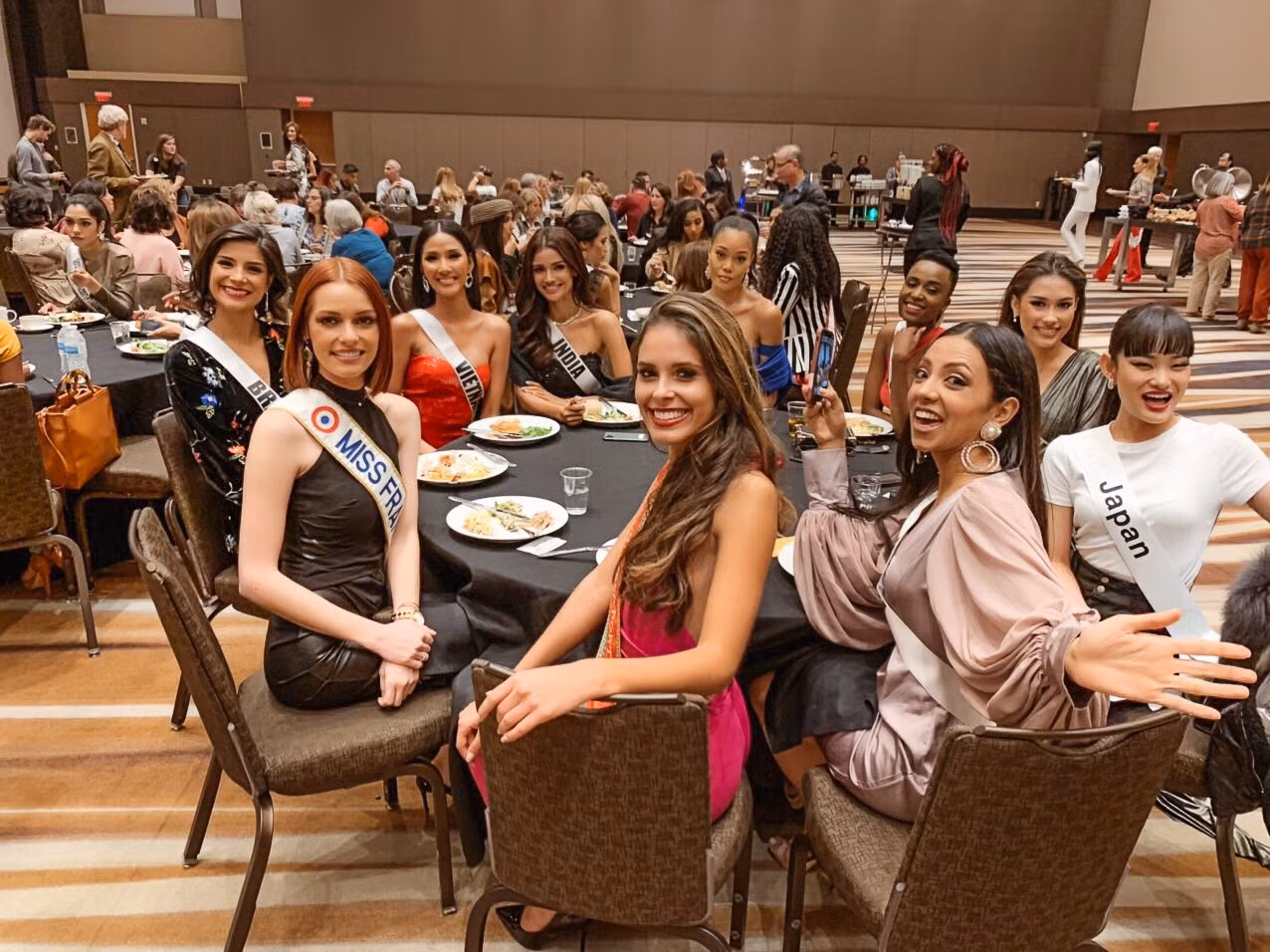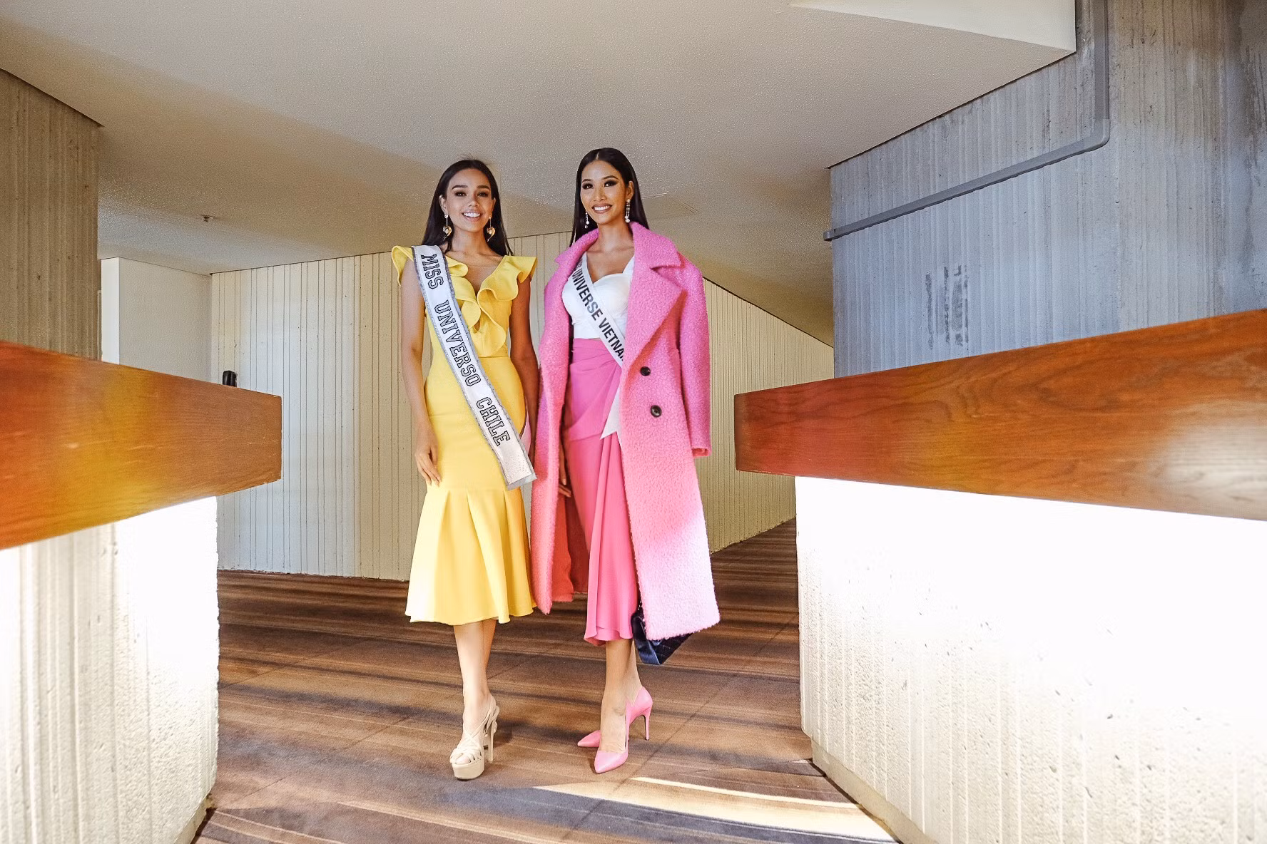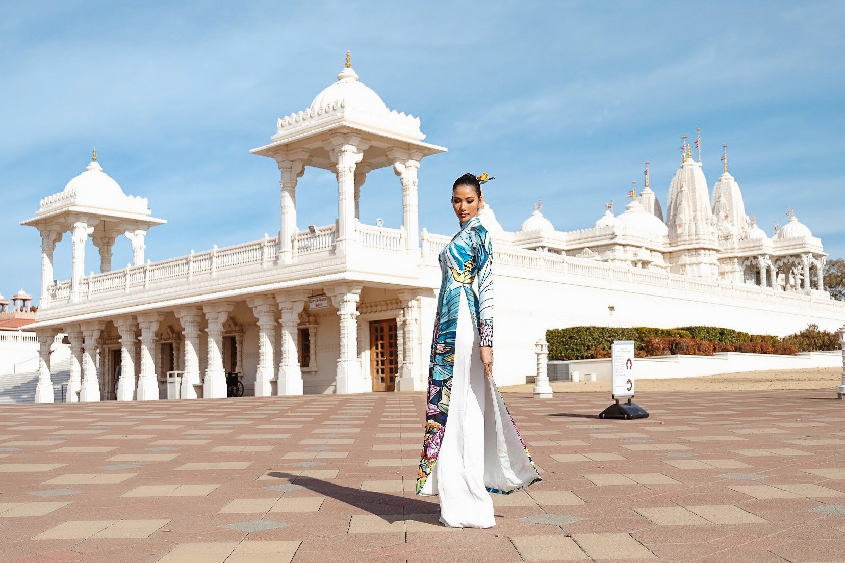 Những hình ảnh đầu tiên từ Mỹ gửi về cho thấy thần thái vui tươi, mạnh khỏe, đặc biệt Hoàng Thùy gây ấn tượng với hình ảnh áo dài hoa Sen.