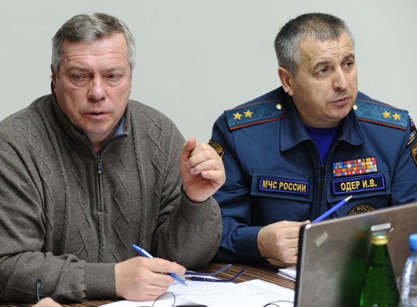 Thống đốc vùng Rostov Vasily Golubev và Thủ trưởng Trung tâm Các tình huống khẩn cấp khu vực phía Nam Nga Igor Oder tại cuộc họp Ban tham mưu điều tra nguyên nhân tai nạn với chiếc máy bay chở khách Boeing-737-800 ở sân bay Rostov.