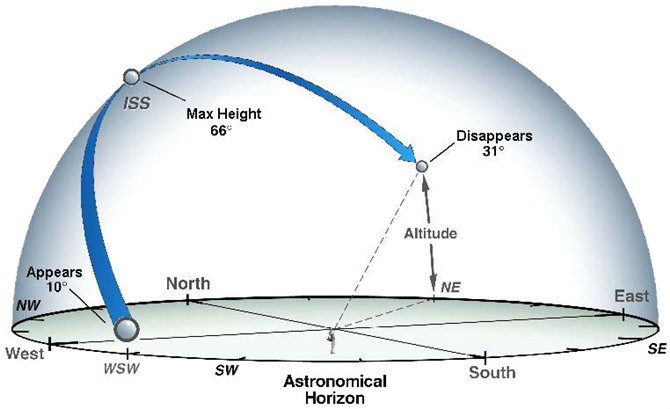 Điểm xuất hiện là vị trí trên bầu trời nơi ISS được nhìn thấy đầu tiên. Khái niệm này cũng như chiều cao tối đa và được đo bằng độ tính từ đường chân trời. Các chữ cái đại diện cho các hướng của la bàn trong tiếng Anh.