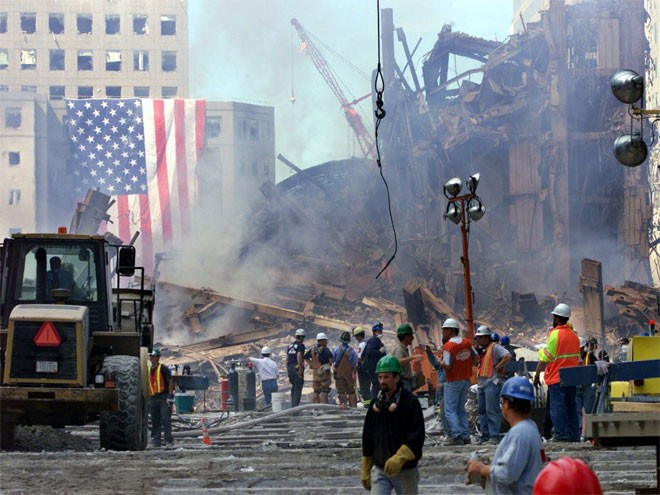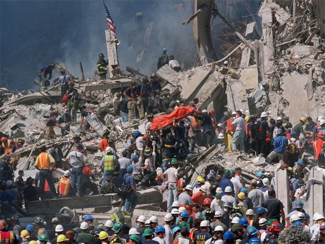 Thi thể các nạn nhân lần lượt được đưa ra từ đống đổ nát trong khi quốc kỳ Mỹ vẫn tung bay ở hiện trường vụ khủng bố như một bằng chứng về sự kiên cường của đất nước vừa bị tấn công.