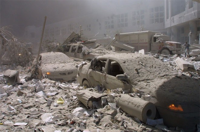 Cảnh tượng khu vực xung quanh WTC cho thấy sự tàn phá khủng khiếp. Bầu không khí đặc quánh khói và bụi. Vô số xe cộ bị phá hủy bẹp dúm.