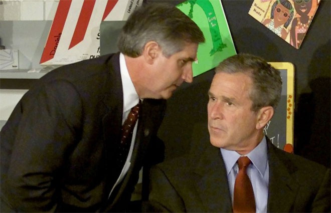 Tổng thống Mỹ khi đó George W. Bush được báo tin về vụ tấn công khủng bố khi ông đang tham dự sự kiện tại một trường học. Nhưng biểu hiện trên khuôn mặt người đứng đầu Nhà Trắng chưa có biểu hiện gì của sự hoảng hốt. Không ai trong Chính phủ Mỹ vào thời điểm đó biết sự việc nghiêm trọng tới mức nào.