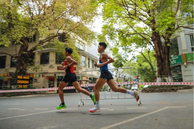 Yếu tố chuyên môn cũng được nhà tổ chức giải chú trọng khi Ecopark Marathon quy tụ những chân chạy hàng đầu hệ tuyển lẫn phong trào. Trong ảnh là Nguyễn Văn Lai so kè cùng Trần Văn Đảng ở những km đầu tiên cự ly 21km. Hai tuyển thủ quốc gia đem đến màn tranh tài hấp dẫn đến những phút cuối cùng, trước khi Nguyễn Văn Lai bứt lên, cán đích đầu tiên.