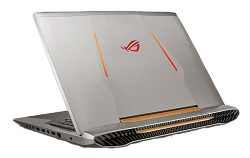 Laptop chơi game cao cấp của Asus sở hữu dáng vẻ hầm hố với hốc tản nhiệt lớn phía sau. Máy có lớp vỏ bằng hợp kim nhưng phối tông màu cam đỏ theo biểu tượng ROG. Sản phẩm có kích thước màn hình lớn tới 17,3 inch và cân nặng 4,4 kg.