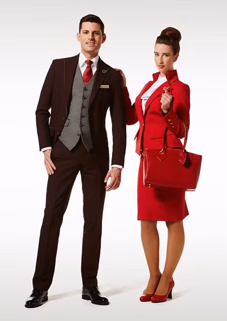 Qantas: Hãng hàng không của Úc sử dụng tông màu đen làm chủ đạo với những điểm nhấn màu đỏ và hồng tạo nên vẻ bí ẩn và sự tươi tắn cho mỗi chuyến bay. Với cách pha trộn màu sắc này, những bộ đồng phục trở nên đầy ấn tượng mà không lòe loẹt, tạo nên cảm giác phấn khích cho các hành khách, nhưng vẫn không đánh mất vẻ chuyên nghiệp của đội ngũ tiếp viên. Không ít người đã liên tưởng những tiếp viên của hãng bay Qantas là những điệp viên trong tiểu thuyết trinh thám.