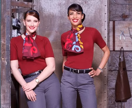 Porter Airlines: Hãng bay của Canada thiết kế đồng phục lấy cảm hứng từ thời trang ở những thập niên trước, khi di chuyển bằng máy bay vẫn còn là sự kiện đặc biệt đối với mỗi hành khách, thuở đó, cả tiếp viên hàng không và hành khách đều ăn vận sang trọng bước lên máy bay, đây được coi là thời kỳ hoàng kim của “nghề bay”. Điểm nhấn của bộ trang phục là chiếc khăn quàng cổ đuyên dáng và một chiếc mũ tròn nhỏ cổ điển.