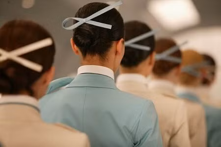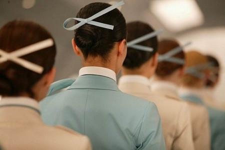 Korean Airlines: Mẫu đồng phục của Korean Airlines đem lại cảm nhận về sự mềm mại và yên bình. Hai gam màu xanh sáng và kem vừa khiến các nữ tiếp viên có được vẻ ngoài duyên dáng, chuyên nghiệp vừa nhã nhặn, khiêm nhường, gây thiện cảm lớn đối với hành khách. Thêm vào đó, nơ buộc tóc được thiết kế “ton sur ton” khiến cách phục sức của đội ngũ tiếp viên hàng không Korean Airlines thêm phần nổi bật.