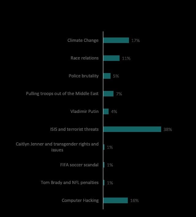 38% những người tham gia khảo sát lo lắng về chủ nghĩa khủng bố của nhà nước tự xưng IS. 17% lo sợ về sự biến đổi khí hậu và 16% số người được hỏi lo về vấn nạn máy tính bị các hacker đe dọa.