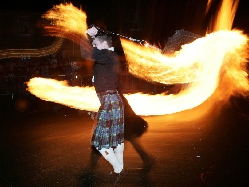 Tại Stonehaven, Scotland, người dân thường quay quả cầu lửa trong lễ hội Hogmanay vào đêm giao thừa để xua đuổi ma quỷ.