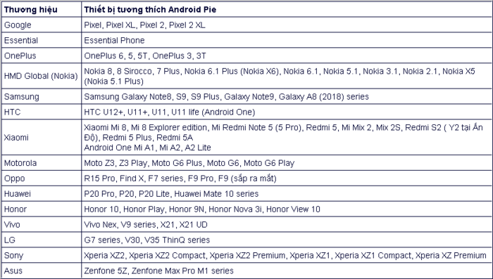 Sau nhiều tháng thử nghiệm, Google đã chính thức giới thiệu Android 9 Pie. Android Pie cập bến đầu tiên trên Pixel của Google và Essential Phone rồi mới đến smartphone các hãng khác như Samsung, Sony, HTC... Lộ trình nâng cấp Android Pie của từng hãng là khác nhau và không phải thiết bị nào cũng tương thích với phiên bản mới. Muốn biết điện thoại Android đang dùng có thể “lên đời” Android Pie hay không, bạn có thể xem danh sách đầy đủ dưới đây: