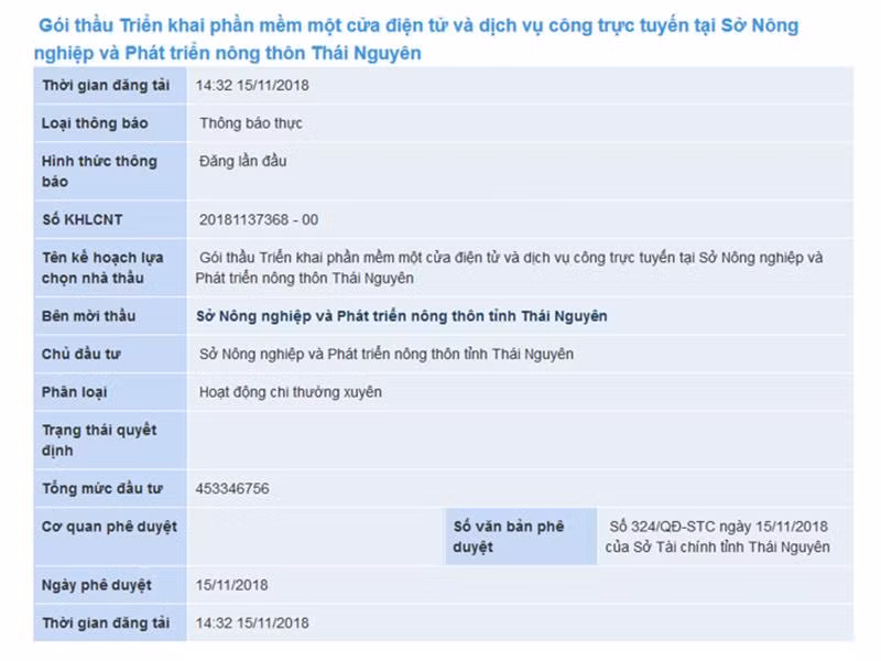 | Dự án Triển khai phần mềm một cửa điện tử và dịch vụ công trực tuyến tại Sở Nông nghiệp và Phát triển nông thôn Thái Nguyên |