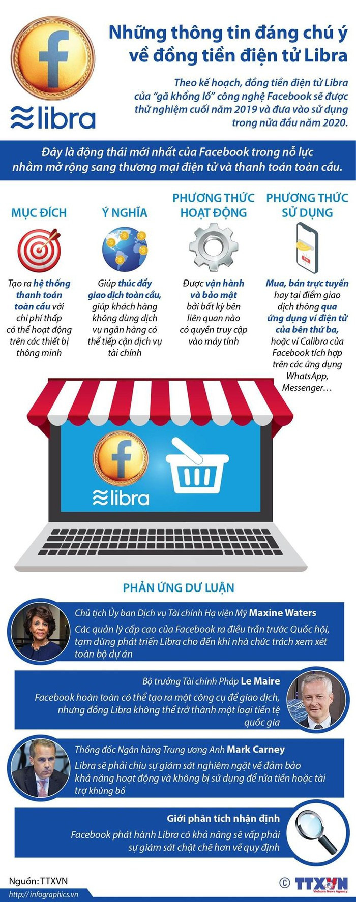 Theo kế hoạch, đồng tiền điện tử Libra của “gã khổng lồ” công nghệ Facebook sẽ được thử nghiệm cuối năm 2019 và đưa vào sử dụng trong nửa đầu năm 2020./.