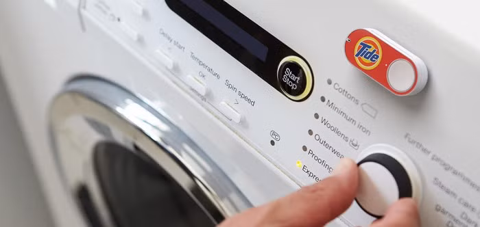 Amazon Dash: Đây là thiết bị điện tử nhỏ gọn được làm bằng nhựa, có thiết kế như một tấm thẻ, bên trên có một nút bấm kết nối với mạng Wifi, các nút có thể được gắn trong tủ hoặc trên máy giặt của gia đình. Ảnh: TechCrunch.