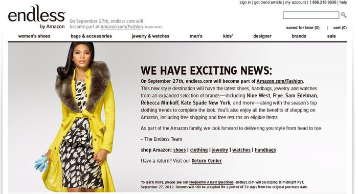 Năm 2012, Amazon đóng cửa Endless.com. Khách hàng khi truy cập vào trang web này sẽ được chuyển hướng đến Amazon.com/f Fashion. Ảnh: Business Insider.