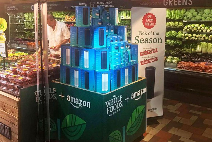 Đây được xem là bước chân đầu tiên vào lĩnh vực bán lẻ truyền thống đến từ “ông vua” thương mại điện tử. Amazon còn tận dụng các cửa hàng Whole Foods để quảng bá dịch vụ Amazon Prime, thậm chí bán loa thông minh Echo bên cạnh hàng táo, chuối trong cửa hàng. Ảnh: Engadget.