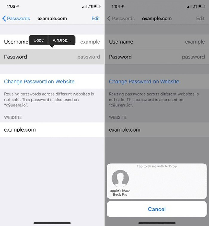 Chia sẻ mật khẩu bằng AirDrop: iOS 12 cho phép người dùng dễ dàng chia sẻ mật khẩu giữa các thiết bị thông qua AirDrop. Để chia sẻ mật khẩu, truy cập menu Settings -> Passwords & Accounts -> Websites & App Passwords, chọn thông tin đăng nhập rồi nhấn và giữ trong trường mật khẩu. Từ cửa sổ bật lên, chọn AirDorp và sau đó chọn thiết bị muốn chia sẻ mật khẩu.