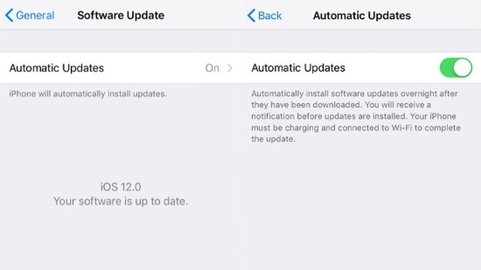 Cập nhật phần mềm tự động: Giờ đây, bạn có thể cho phép iOS tự động cài đặt các bản cập nhật phần mềm mới khi bản cập nhật đó sẵn sàng. Chuyển đến menu Settings > General > Software Update. Kích hoạt tính năng Automatic Updates lên để bật tính năng tự động cập nhật phần mềm. Tất nhiên bạn sẽ nhận được thông báo trước khi cài đặt bản cập nhật iOS.