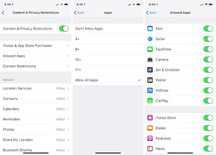 Ẩn ứng dụng: Trên iOS 12, Restrictions (hạn chế tính năng) đã được di chuyển vào trong mục Screen Time. Nếu muốn vô hiệu hóa một ứng dụng như Safari hoặc ẩn một vài ứng dụng để hạn chế quyền truy cập của người khác cần phải truy cập vào Screen Time. Từ trong mục Screen Time, chọn Content & Privacy Restrictions. Sau khi bật tính năng này này, hãy chuyển đến Allowed Apps và tắt các ứng dụng bạn muốn vô hiệu hóa quyền truy cập. Nếu muốn vô hiệu hóa ứng dụng của bên thứ ba, hãy truy cập Content Restrictions -> Apps và chọn ứng dụng phù hợp với độ tuổi bạn muốn cho phép.