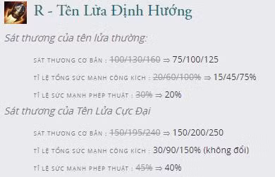 Lựa chọn quá lỗi như vậy đương nhiên Riot không thể làm ngơ quá lâu. Chiêu thức đầu tiên trong bộ kỹ năng của Corki bị đụng chạm là chiêu cuối Tên Lửa Định Hướng. Sức cấu rỉa, dọn lính lẫn dồn sát thương của Corki đang bị đánh giá quá mạnh so với phần còn lại vào giữa trận. Sát thương gây ra từ giàn tên lửa của chiêu cuối Corki đã bị giảm rất nặng trong bản 7.4.