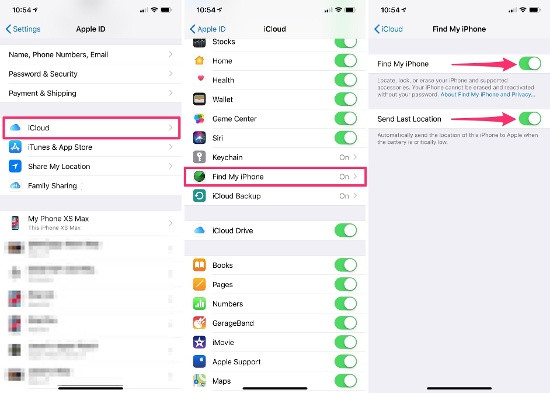 Trên iPhone, hãy mở ứng dụng Settings và nhấn vào tên của bạn ở đầu màn hình. Tiếp theo, chọn iCloud, sau đó cuộn xuống và tìm Find My iPhone. Nhấn vào nó, nếu cả hai công tắc được chuyển sang vị trí On là được. Nếu không, hãy bật cả hai tùy chọn này lên để hoàn tất.