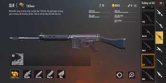 SLR: Thuộc dòng DMR (súng trường bán tự động), SLR sở hữu uy lực từng viên đạn khá lớn và có thể dễ dàng xuyên thủng giáp của đối thủ. Tuy nhiên, SLR lại có điểm yếu nằm ở độ giật khá lớn cùng lượng đạn ít ỏi. Thêm vào đó, việc SLR sử dụng đạn 7.62mm cũng khiến balo người chơi nặng hơn nếu quyết định lựa chọn khẩu súng này. Ảnh: KINCIR.