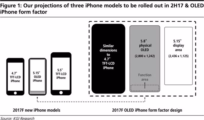 Theo dự báo mới của Nikkei, iPhone 8 sẽ sở hữu một màn hình OLED 5.8 inch. 2 phiên bản còn lại là iPhone 7s và 7s Plus sử dụng màn hình có kích thước lần lượt là 4.7 inch và 5.5 inch. Cả hai mẫu điện thoại này sẽ tiếp tục sử dụng màn hình LCD. Ming-Chi Kuo cũng có dự đoán tương tự và cho rằng phải đến năm 2018, Apple mới hoàn toàn dùng màn hình OLED cho iPhone.