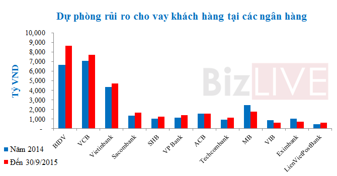 Xét về số tuyệt đối, nợ có khả năng mất vốn tại 3 đầu tàu ngành ngân hàng hiện nay là BIDV, Vietcombank, Vietinbank vẫn luôn ở mức cao nhất. BIDV tăng 72,36% so với cuối năm ngoái lên mức 5.631 tỷ đồng. Trong khi đó, Vietcombank tăng 38,28% lên 4.938 tỷ đồng, Vietinbank tăng 28,78% lên mức 2.685 tỷ đồng.