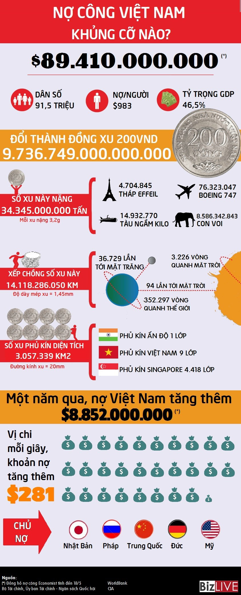 Tính đến ngày 18/5, theo đồng hồ báo nợ toàn cầu của tạp chí Economist, nợ công Việt Nam đang ở mức xấp xỉ 89,41 tỷ USD. Với dân số ước tính 91,5 triệu người, tính ra, mỗi người dân đang gánh nợ 983USD. Một năm trước, con số này là 81,18 tỷ USD và 897,84 USD.