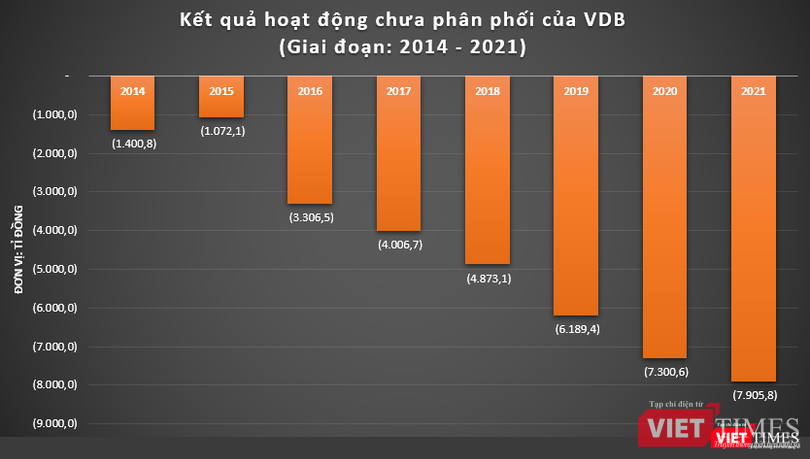 Chất lượng tài sản cũng phần nào ảnh hưởng tới kết quả kinh doanh của VDB. Sau nhiều năm thua lỗ triền miên, tính đến cuối năm 2021, kết quả hoạt động chưa phân phối của VDB ở mức âm 7.905,8 tỉ đồng – cao gấp 7,9 lần so với thời điểm cuối năm 2015.