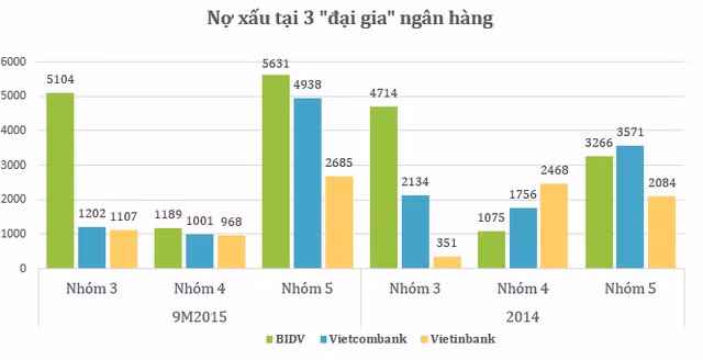 Theo thống kê của người viết từ báo cáo tài chính hợp nhất quý III/2015, tổng số nợ trong 9 tháng đầu năm nay của riêng 3 “đại gia” ngân hàng Vietcombank, Vietinbank và BIDV đã lên tới 23.825 tỷ đồng, tăng 11,2% so với thời điểm cuối năm 2014. Trong số này, nợ có khả năng mất vốn là 13.254 tỷ đồng, chiếm hơn một nửa tổng số nợ xấu.