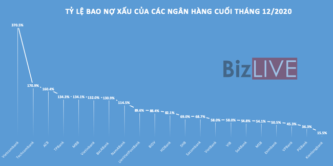 Dữ liệu của BizLIVE cho thấy, đến cuối năm 2020, chi phí dự phòng của 20 ngân hàng tăng tới 27,6% so với đầu năm. Có tới 14/20 ngân hàng có tỷ lệ bao phủ nợ xấu (LLC) tăng trong năm qua, trong đó, có 8 thành viên đạt LLC trên 100%, các biệt có ngân hàng đạt tới 370,5%.