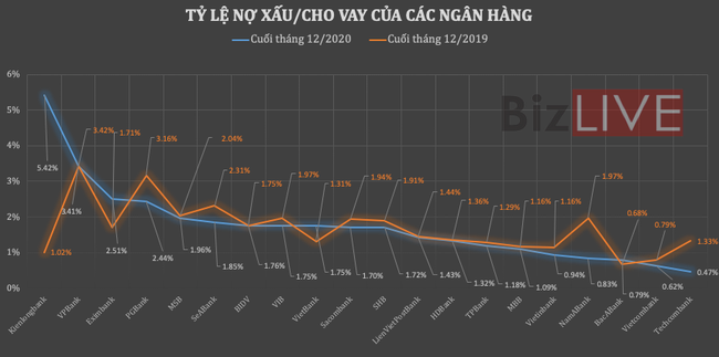 Tương tự, nợ xấu nội bảng của Techcombank trong năm qua đã giảm mạnh từ 3.077 tỷ đồng xuống còn 1.295 tỷ đồng, tương đương giảm 58%. Trong khi đó, cho vay khách hàng tăng trưởng tới 20,2% khiến tỷ lệ nội xấu của ngân hàng đến cuối năm 2020 chỉ còn 0,47%, so với mức 1,33% hồi đầu năm. Techcombank cũng là ngân hàng đang có tỷ lệ nợ xấu/cho vay thấp nhất trong nhóm khảo sát.