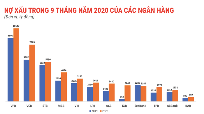 Ở một khía cạnh khác, nợ xấu trong 9 tháng đầu năm của hầu hết các ngân hàng cũng bắt đầu tăng nhanh.