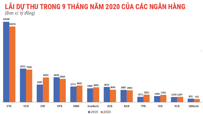 Trong kỳ này, khoản “lãi dự thu” không biến động nhiều, thậm chí gần nửa ngân hàng đã công bố báo cáo tài chính lại cho thấy xu hướng giảm. Như vậy, các ngân hàng lãi lớn chủ yếu do chưa mạnh tay trích lập dự phòng.