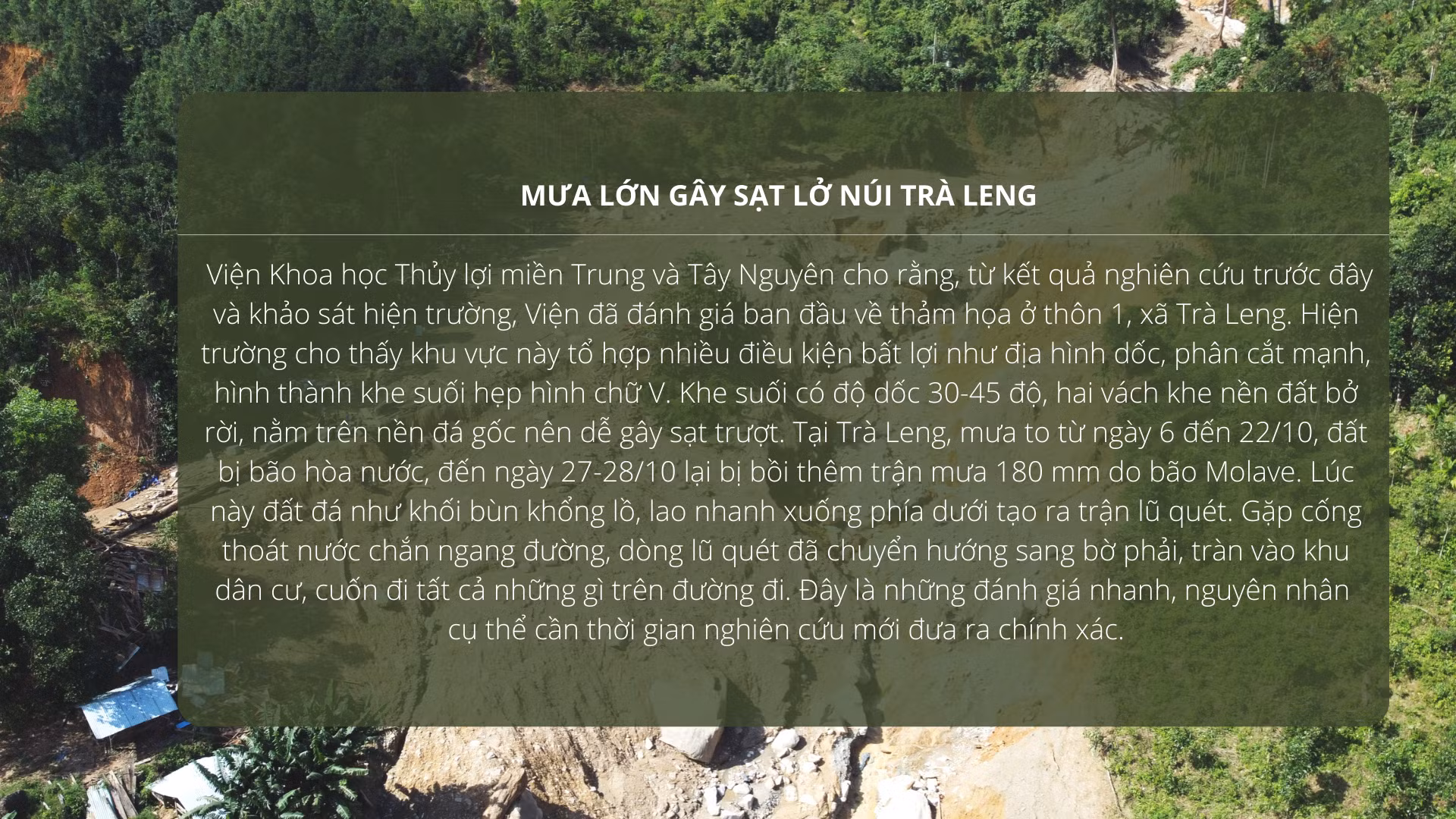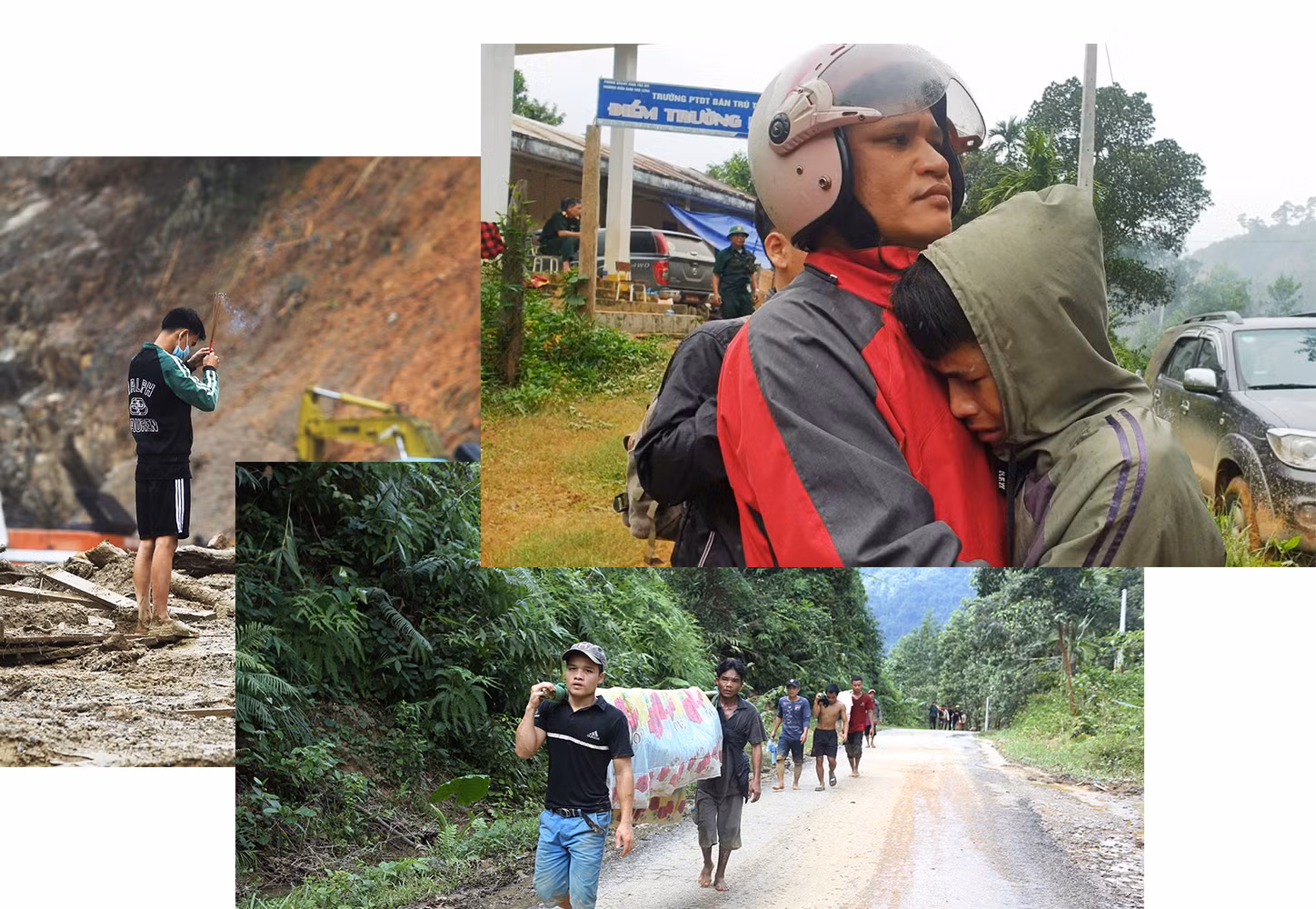 Chiều 29/10, sau một ngày thảm họa xảy ra, chúng tôi tiếp cận hiện trường. Để đến được đây, từ đầu xã Trà Leng dừng xe máy và đi bộ 6km gần 1 giờ đồng hồ. Trên đường đi, gần 10 điểm sạt lở, có nơi bùn sụp đến bắp đùi. Chúng tôi bắt gặp những thanh niên khỏe mạnh dùng võng gánh những người gặp nạn vượt 16km ra đến quốc lộ 40B, đoạn xã Trà Dơn.