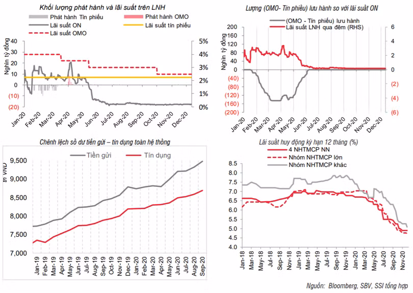 Theo SSI, trong quý cuối năm, tín dụng tăng trưởng khả quan hơn nhưng thanh khoản các NHTM vẫn rất dồi dào, lãi suất liên ngân hàng và lãi suất tiền gửi sẽ vẫn duy trì xu hướng đi ngang trong một vài tháng tới.