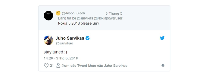 Theo đó, trong khi trả lời bình luận cho một người dùng trên Twitter, Giám đốc sản phẩm của HMD Global – Juho Sarvikas đã gợi ý rằng chiếc Nokia 5 2018 đang được phát triển và người dùng hãy “để mắt đến nó”.