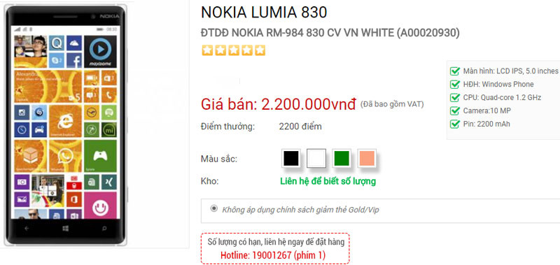 Sau một thời gian vắng bóng, Nokia Lumia 830 đã lên kệ trở lại ở thị trường Việt Nam hồi tháng 8 vừa qua với giá 2,99 triệu đồng. Mới đây, Lumia 830 tiếp tục được giảm giá xuống còn 2,2 triệu đồng.