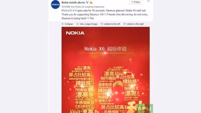 Thông báo của HMD Global cho biết Nokia X6 bán hết chỉ trong 10 giây - Ảnh: nokiapoweruser