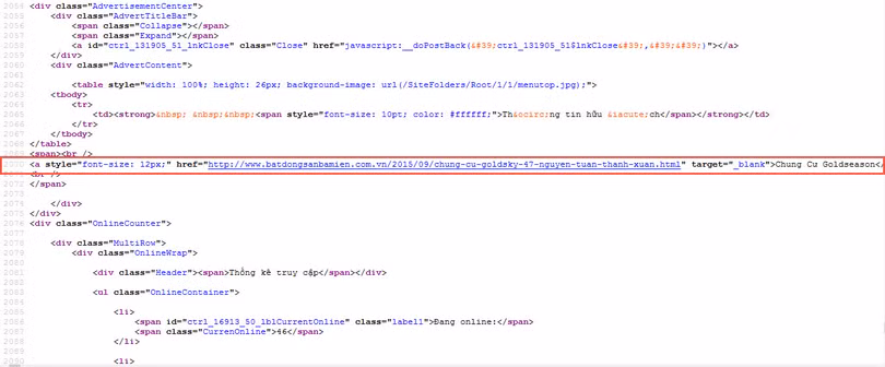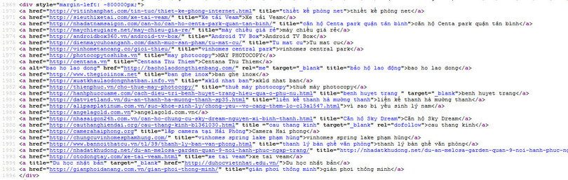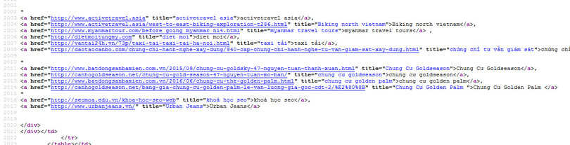 Cụ thể các textlink như sau: “can ho the goldview”, “celadon city”, “dự án vinhomes central park”, “vinhomes ba son”, “vinhomes mỹ đình”, “vinhomes golden river”, “máy lọc nước kangaroo”. “chung cư goldseason” “Căn hộ Hà Đô Centrosa Garden quận 10”, “căn hộ sài gòn metro park”, “Toyota Mỹ Đình”,” toyota hai duong”, “Chung Cư Goldseason”, “VietJet Air”…