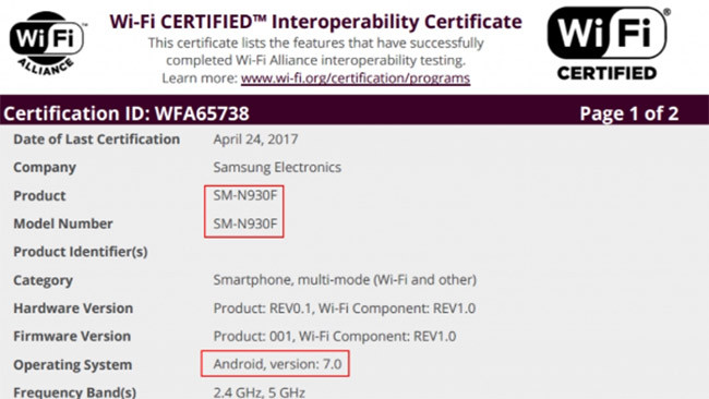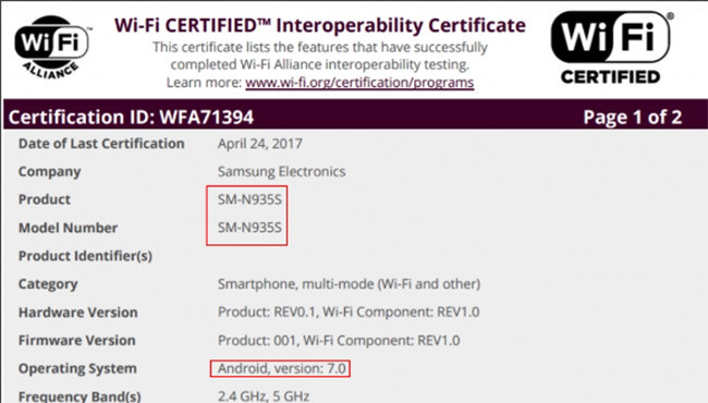 Hình ảnh chứng chỉ Wi-Fi cho thấy SM-N935S sẽ được cài đặt Windows 7.0. Chữ S ở cuối có nghĩa là South Korea – điện thoại sẽ được phát hành ở thị trường Hàn Quốc.